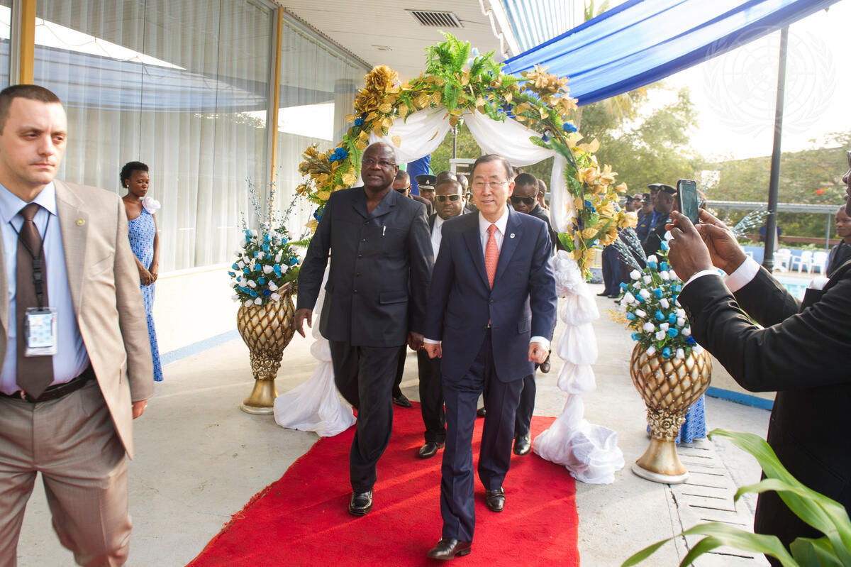 Secretary-General Ban Ki-moon (centre right) arrives with with with Ernest Bai Koroma (centre left), President of the Republic of Sierra Leone, for the ceremony marking the closure of the UN Integrated Peace Building Mission in Sierra Leone (UNIPSIL), and the transfer of its responsibilities to the UN country team.