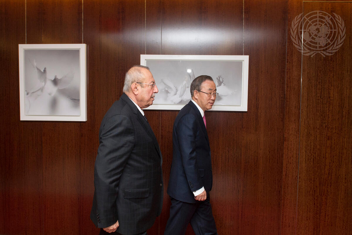 Secretary-General Ban Ki-moon (right) and Rowsh Shaways, Deputy Prime Minister of Iraq, are seen walking together before a meeting at UN Headquarters in New York.