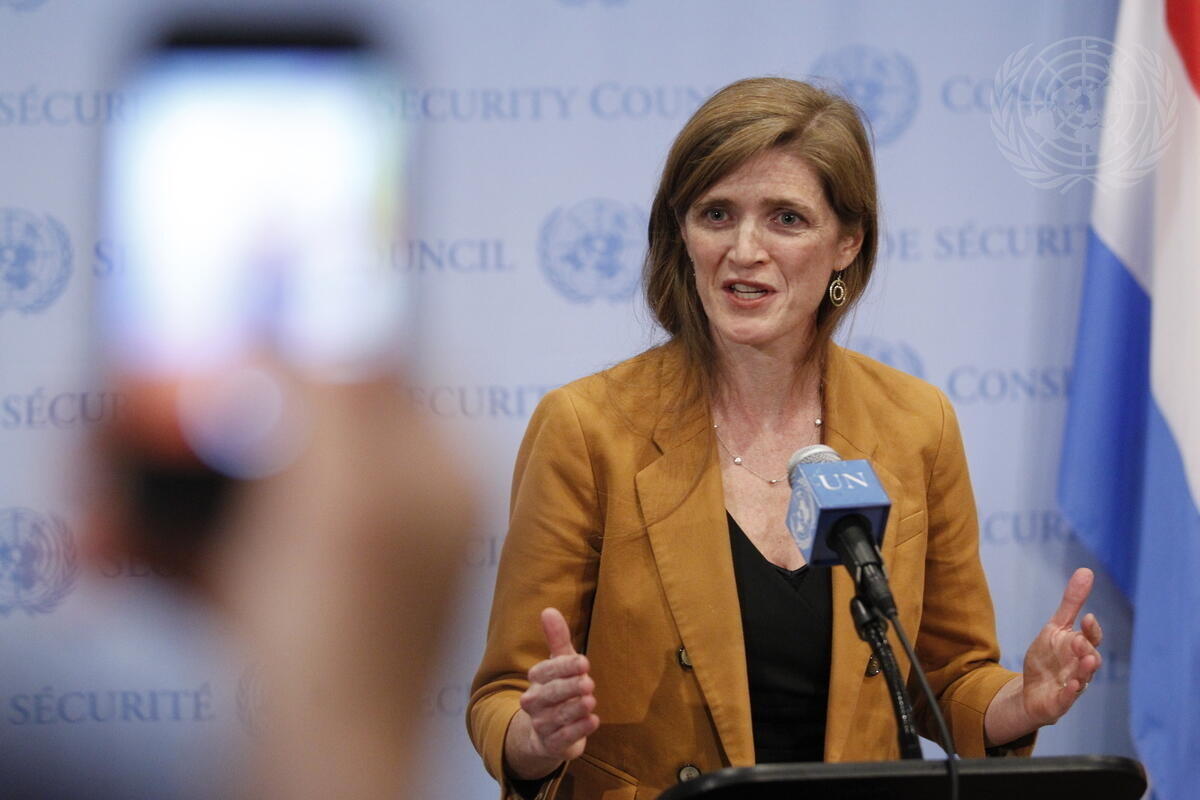 Samantha Power, United States Permanent Representative to the UN, briefs journalists following a Security Council meeting on the situation in Ukraine.