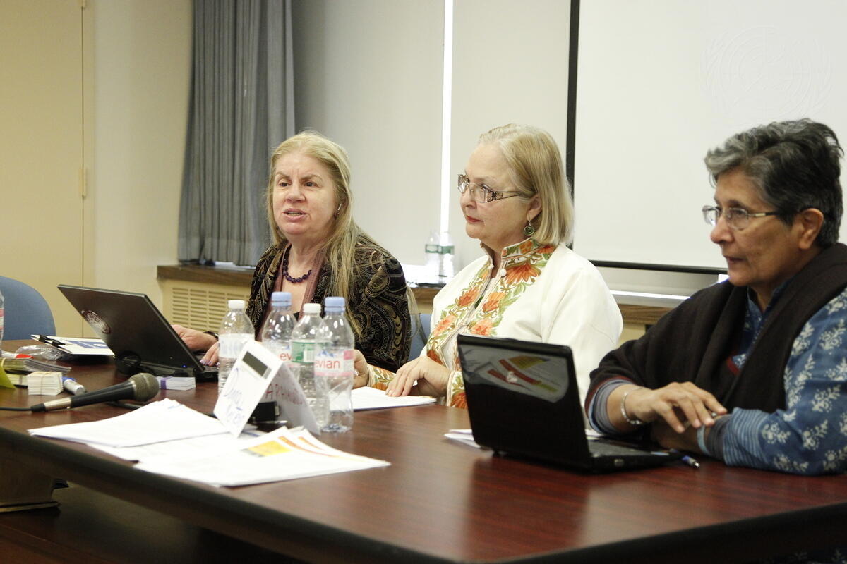 Stephanie Ortoleva (left), President of Women Enabled, speaks at the event. Also on the panel: Donna M. Mertens (centre), Professor in the Department of Education at Gallaudet University, and Asha Hans (right), Founder of the Women with Disabilities India Network.