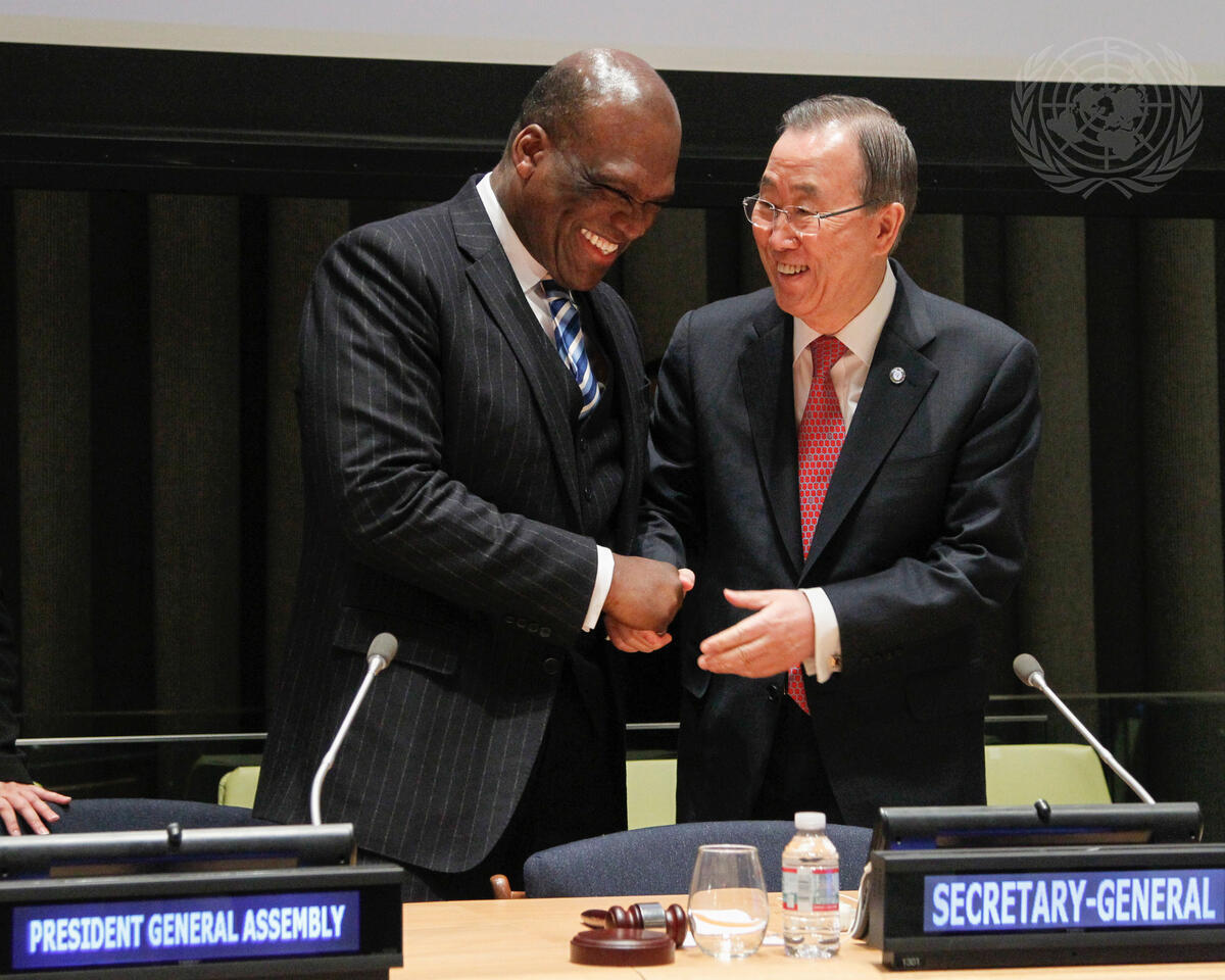 John Ashe (left), President of the sixty-eighth session of the General Assembly, and Secretary-General Ban Ki-moon share a light moment at the event.