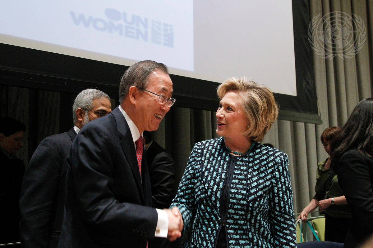 Secretary-General Ban Ki-moon (centre left) greets Hillary Rodham Clinton, former United States Secretary of State, at the event.