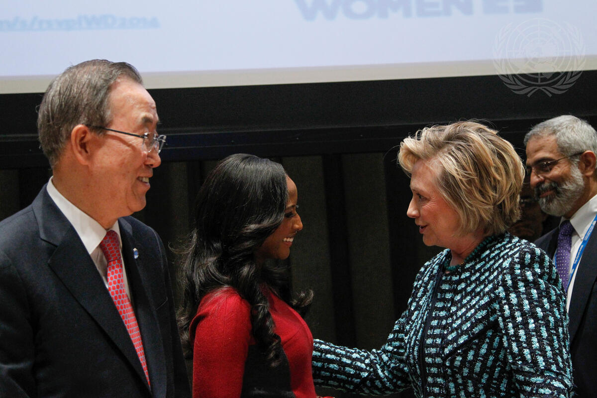 Hillary Rodham Clinton (second from right), former United States Secretary of State, greets CNN International anchor, Isha Sesay, at the event, as Secretary-General Ban Ki-moon (left) looks on.