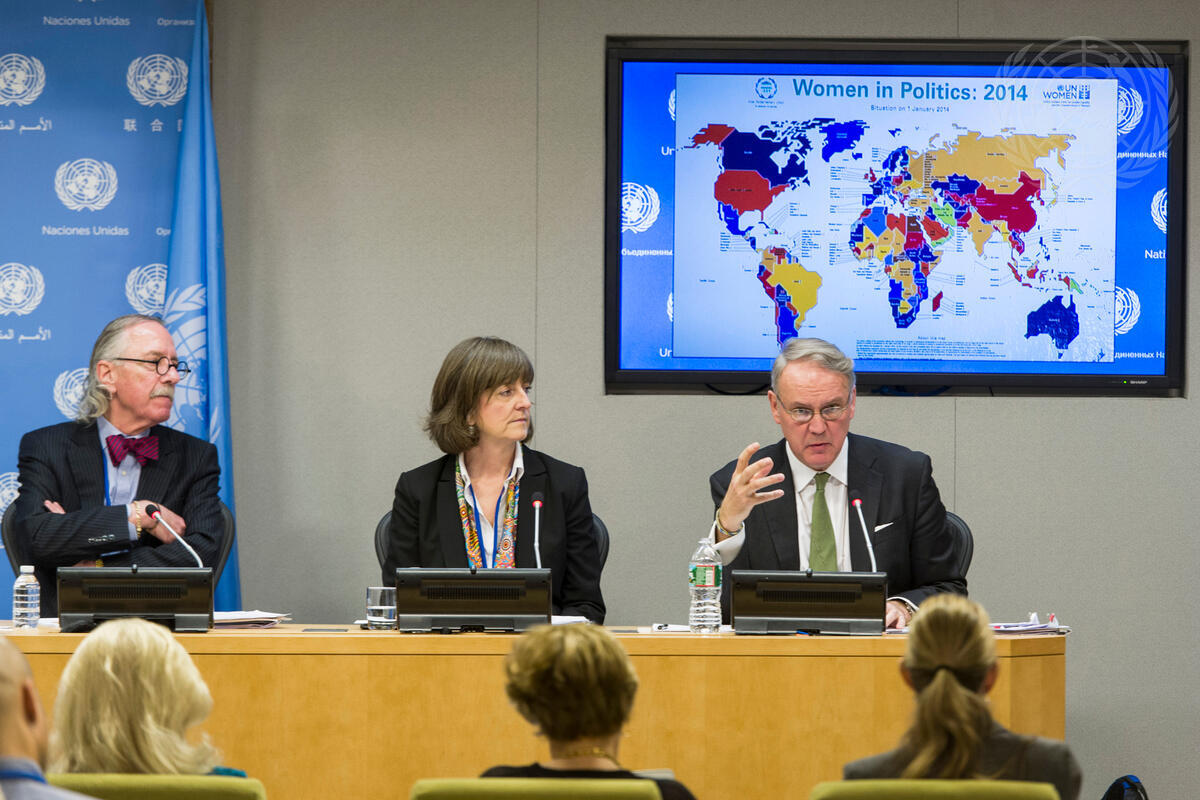 John Hendra (right), Deputy Executive Director of the UN Entity for Gender Equality and the Empowerment of Women (UN Women), and Anders B. Johnsson (left), Secretary General of the Inter-Parliamentary Union (IPU), brief journalists on the launch of the IPU-UN Women ""Global Map of Women in Politics"".