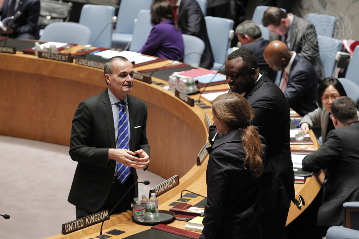 Gérard Araud (left), Permanent Representative of France to the UN, consults with fellow Security Council members, Samantha Power, United States Permanent Representative to the UN, and Eugène-Richard Gasana, Permanent Representative of the Republic of Rwanda to the UN, during its meeting on the situation in Libya.