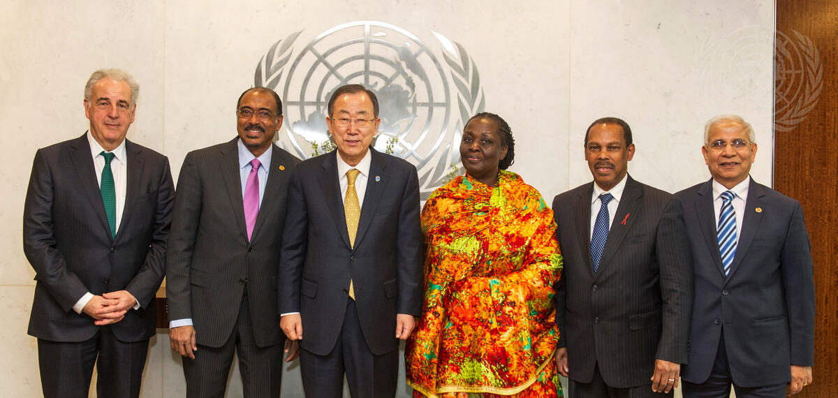 Secretary-General Ban Ki-moon (third from left) meets with Michel Sidibé (secod from right), UNAIDS Executive Director, and the Regional Special Envoys for HIV/AIDS, from left: Michel Kazatchkine, Secretary-General’s Special Envoy for AIDS in Eastern Europe and Central Asia; John Edward Greene, Secretary-General’s Special Envoy for AIDS in the Caribbean; Speciosa Wandira-Kazibwe, Secretary-General’s Special Envoy for HIV/AIDS in Africa; and J.V.R.Prasada Rao; Secretary-General’s Special Envoy for AIDS in Asia and the Pacific.
