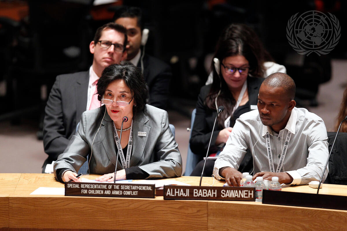Leila Zerrougui (left), Special Representative of the Secretary-General for Children and Armed Conflict, addresses the the Security Council open debate on the issue. At her side is Alhaji Babah Sawaneh, former child soldier from Sierra Leone.