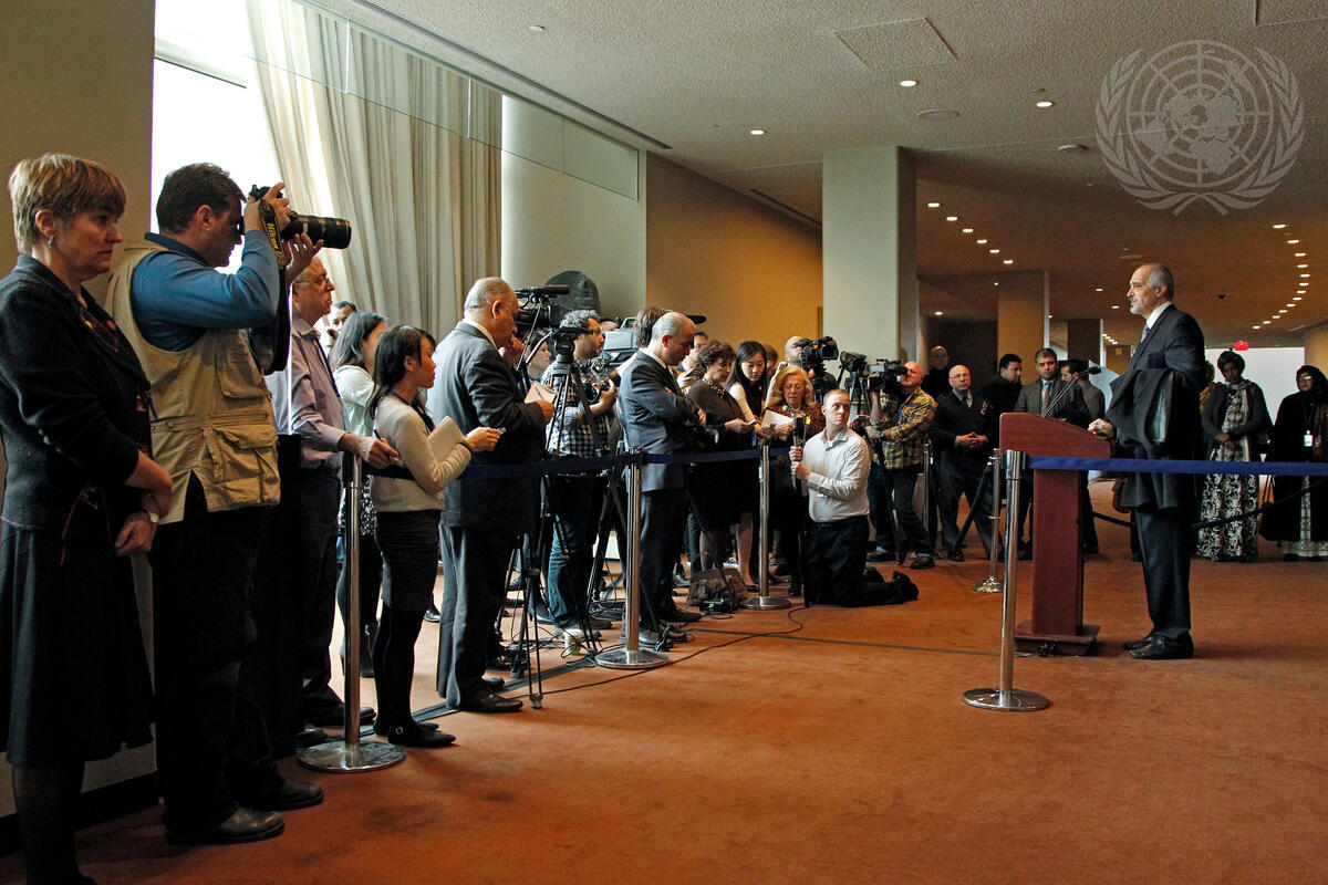 Bashar Ja’afari (right, at lectern), Permanent Representative of the Syrian Arab Republic to the UN, briefs journalists following a closed-door briefing to the General Assembly on the situation in his country by Secretary-General Ban Ki-moon and Lakhdar Brahimi, Joint Special Representative of the UN and the League of Arab States for Syria.