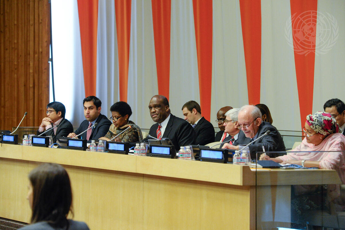 A view of the speakers’ dais as John Ashe (centre), President of the Assembly’s sixty-eighth session, addresses the opening of the event. Also pictured (starting second from left): Ahmad Alhendawi, the Secretary-General’s Envoy on Youth; Phumzile Mlambo-Ngcuka, Executive Director of the UN Entity for Gender Equality and the Empowerment of Women (UN Women); Tony Lake, Executive Director of the UN Children’s Fund (UNICEF); and Amina Mohammed, Special Adviser to the Secretary-General for Post-2015 Development Planning.