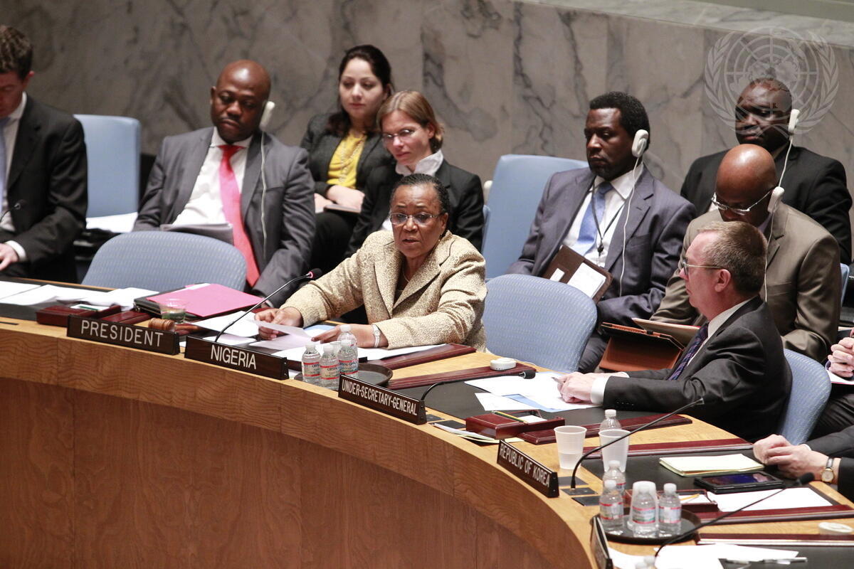 U. Joy Ogwu (centre), Permanent Representative of Nigeria to the UN and President of the Security Council for April, addresses the Council’s meeting on the situation in Ukraine. On her left is Jeffrey Feltman, Under-Secretary-General for Political Affairs.