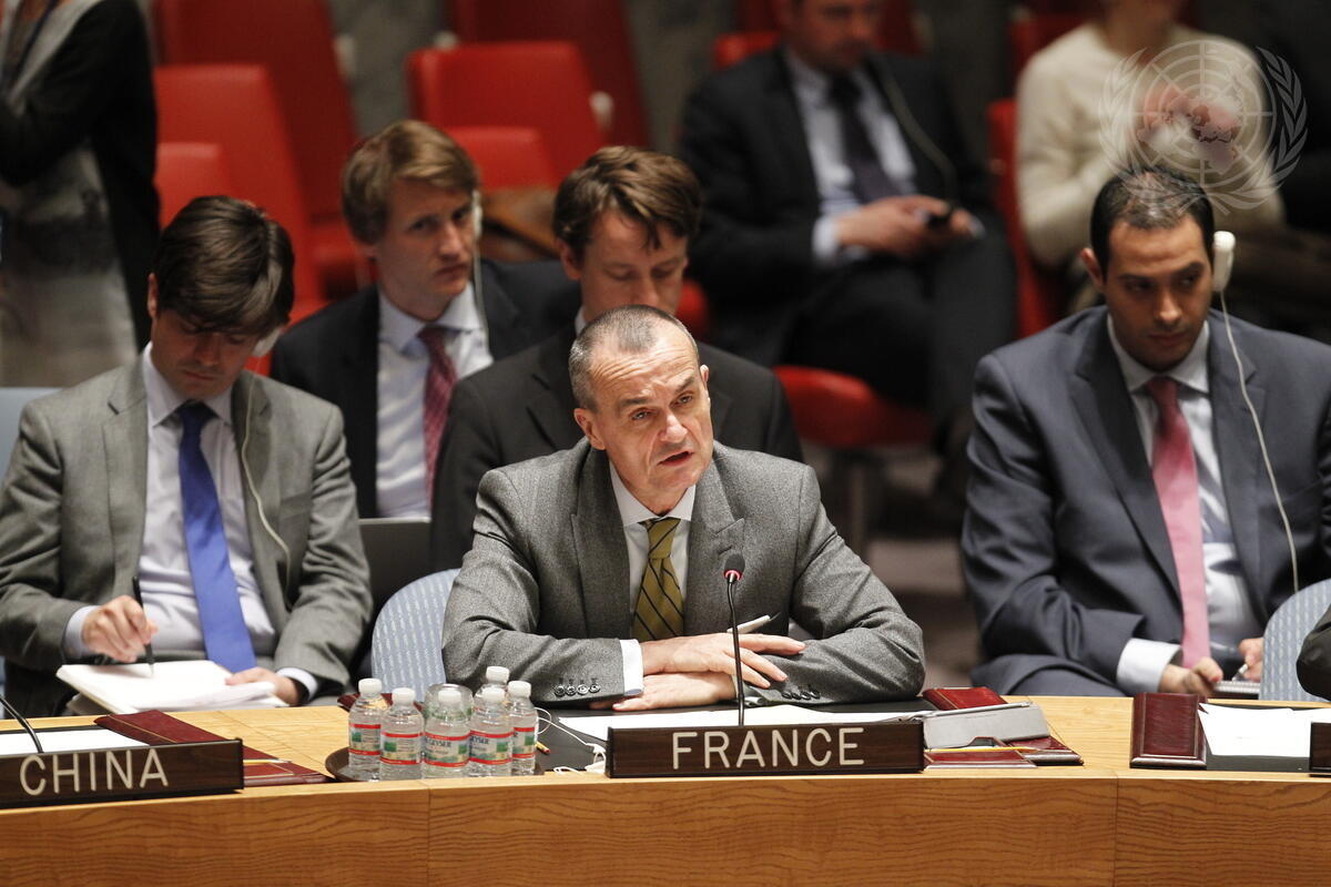 Gérard Araud (centre), Permanent Representative of France to the UN, addresses the Security Council meeting on the situation in Ukraine.