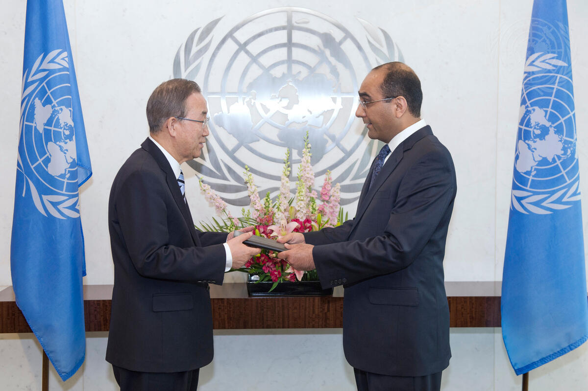Muzaffarbek Madrakhimov (right), new Permanent Representative of the Republic of Uzbekistan to the United Nations, presents his credentials to Secretary-General Ban Ki-moon.
