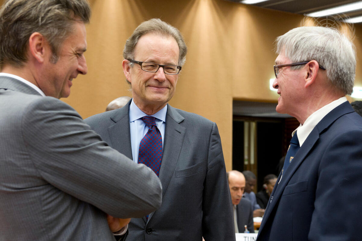Michael Møller (centre), Acting Director-General UN Office at Geneva, arrives at the United Nations Roundtable on Legal Aspects of the question of Palestine convened by the Committee on the Exercise of the Inalienable Rights of the Palestinian People.