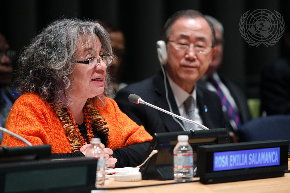 Rosa Emilia Salamanca (left), head of Corporación de Investigación y Acción Social e Económica (CIASE) in Colombia, addresses the opening meeting of the debate. At her side is Secretary-General Ban Ki-moon.