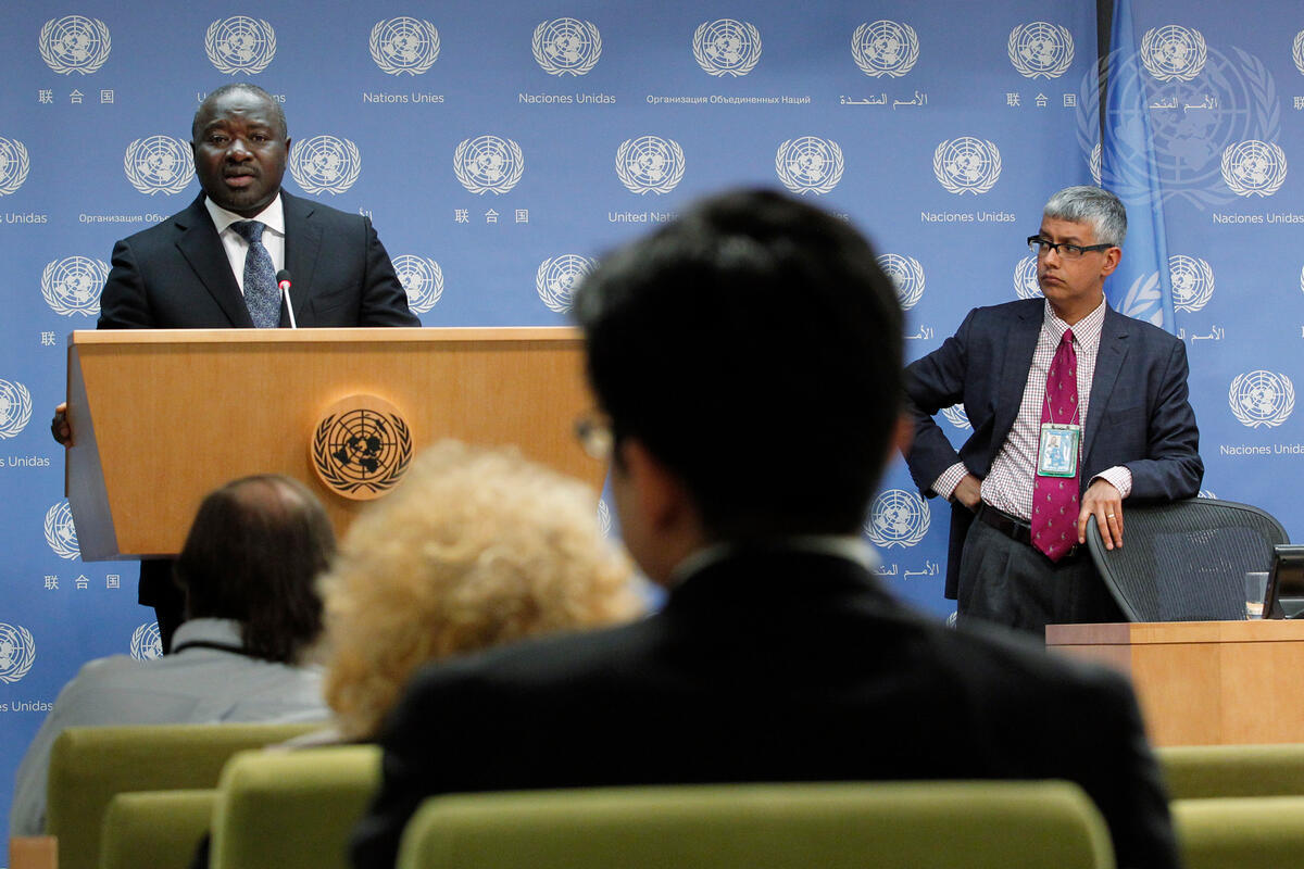 Lassina Zerbo (left), Executive Secretary of the Preparatory Commission for the Comprehensive Nuclear-Test-Ban Treaty Organization (CTBTO), briefs journalists on the readiness of the CTBT international monitoring system to detect nuclear tests. At right is Farhan Haq, Deputy Spokesperson for the Secretary-General.