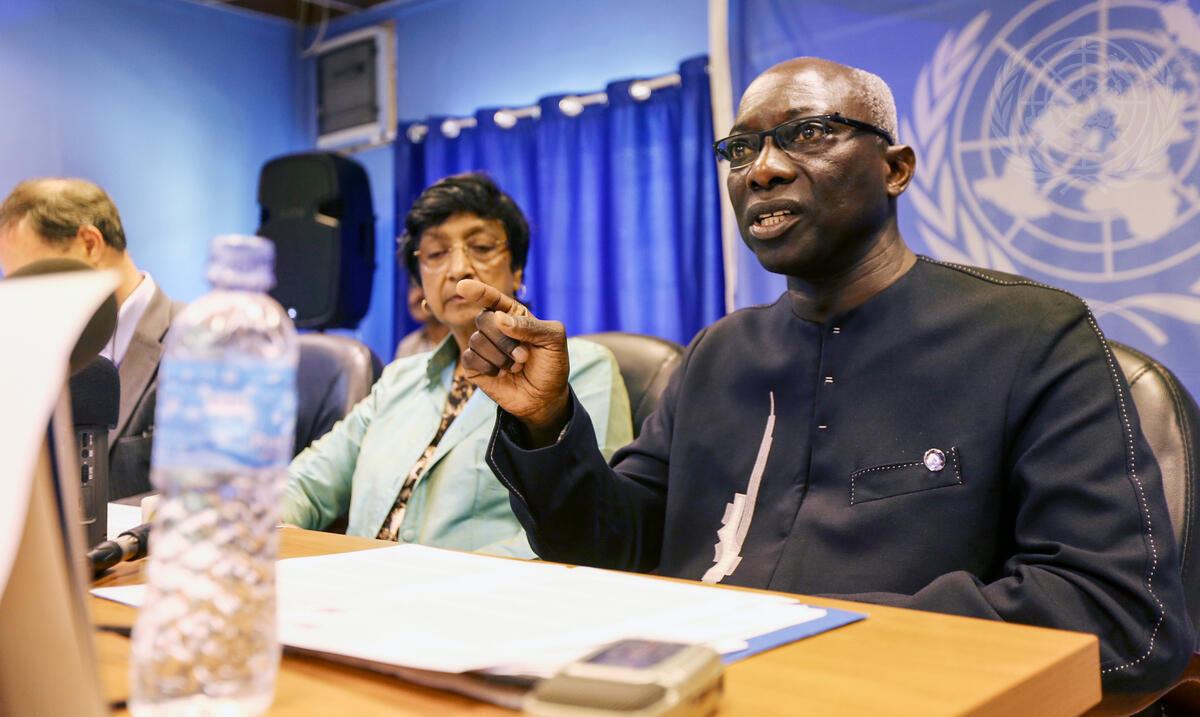 Adama Dieng (right), Special Adviser of the Secretary-General on the Prevention of Genocide, addresses a press conference in Juba, South sudan, with Navi Pillay (centre), UN High Commissioner for Human Rights, at the end of their three-day visit to the country. The visit by the senior UN officials comes in the wake of mass killings earlier this month in Bentiu and Bor.