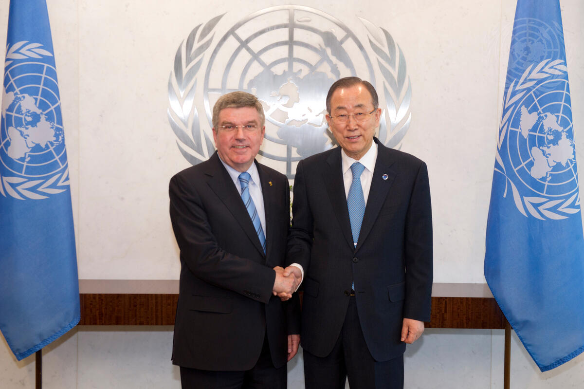 Secretary-General Ban Ki-moon (right) meets with Thomas Bach, President of the International Olympics Committee (IOC).