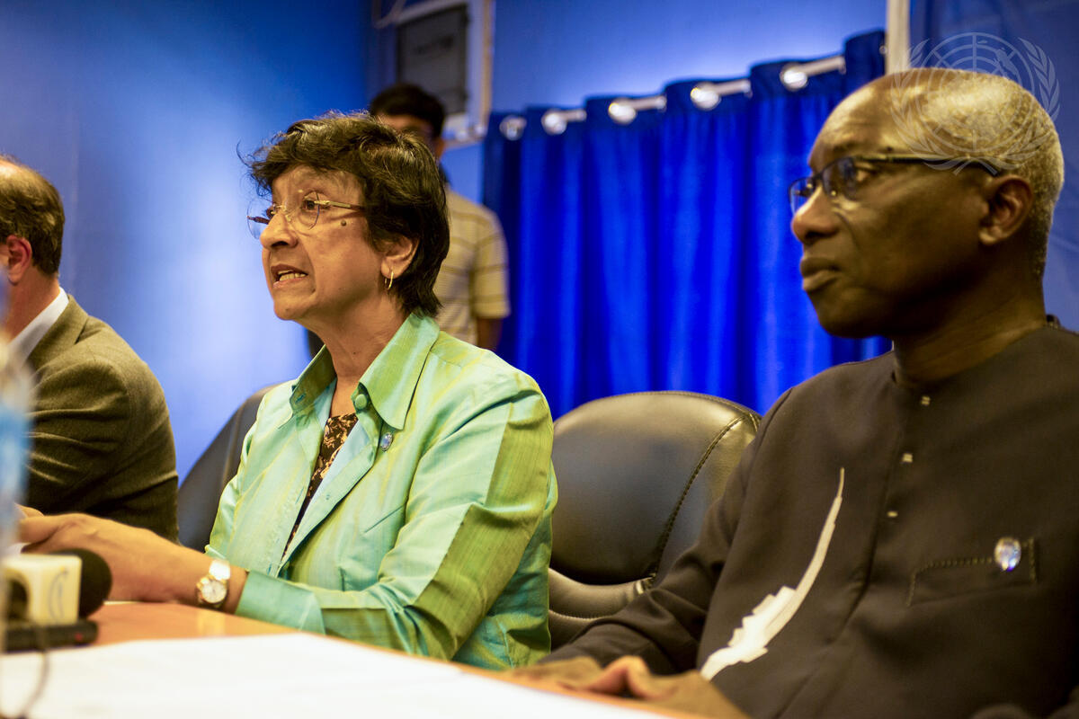Navi Pillay (centre), UN High Commissioner for Human Rights, addresses a press conference in Juba, South Sudan, with Adama Dieng (right), Special Adviser of the Secretary-General on the Prevention of Genocide, at the end of their three-day visit to the country. Their visit comes in the wake of mass killings earlier this month in Bentiu and Bor.