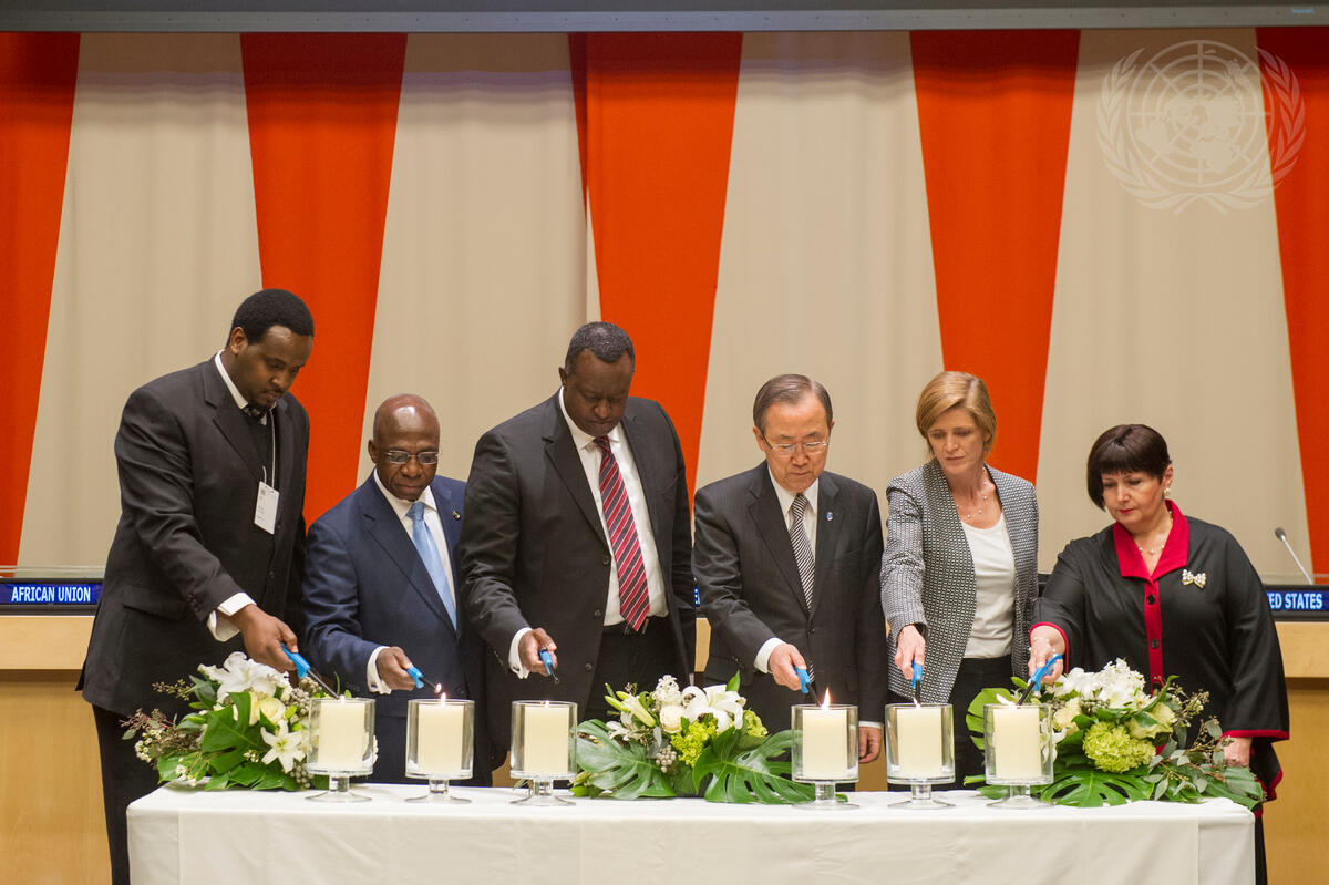 Lighting candles during the commemoration (from left): Kizito Kalima, survivor of the Rwanda genocide; Téte António, Permanent Observer of the African Union to the UN; Eugène-Richard Gasana, Permanent Representative of the Republic of Rwanda to the UN and Minister in Charge of Cooperation; Secretary-General Ban Ki-moon; Samantha Power, Permanent Representative of the United States to the UN; and Simona-Mirela Miculescu, Vice-President of the General Assembly and Permanent Representative of Romania to the UN.