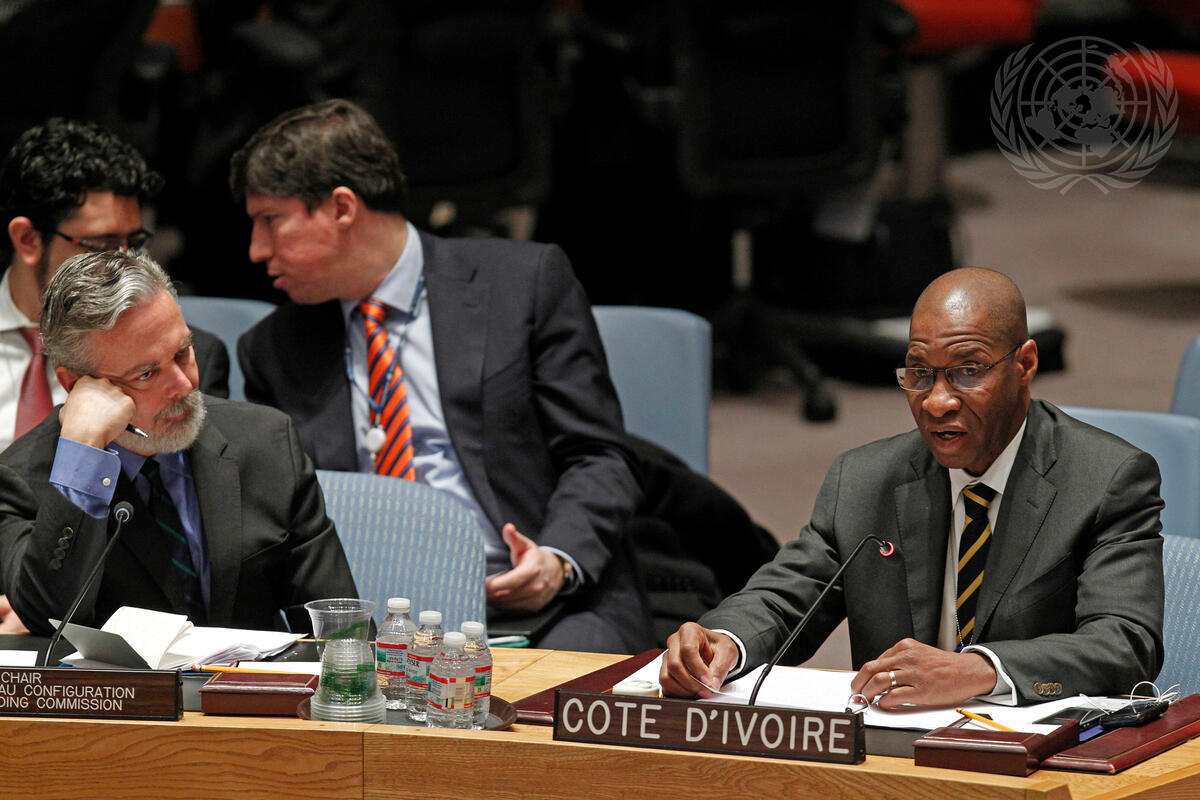 Youssoufou Bamba (right), Permanent Representative of Côte d’Ivoire to the UN, addresses the Security Council meeting on the situation in Guinea-Bissau. On his right is Antonio de Aguiar Patriota, Permanent Representative of Brazil to the UN and Chair of the Guinea-Bissau Configuration of the Peacebuilding Commission.