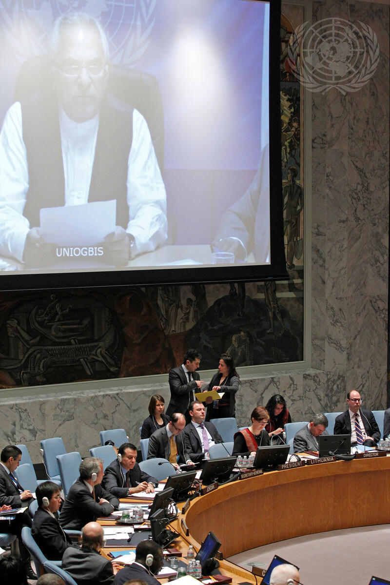 A view of the Security Council Chamber as José Ramos-Horta (shown on screen), Special Representative of the Secretary-General and Head of the UN Integrated Peacebuilding Office in Guinea-Bissau (UNIOGBIS), briefs the Council.