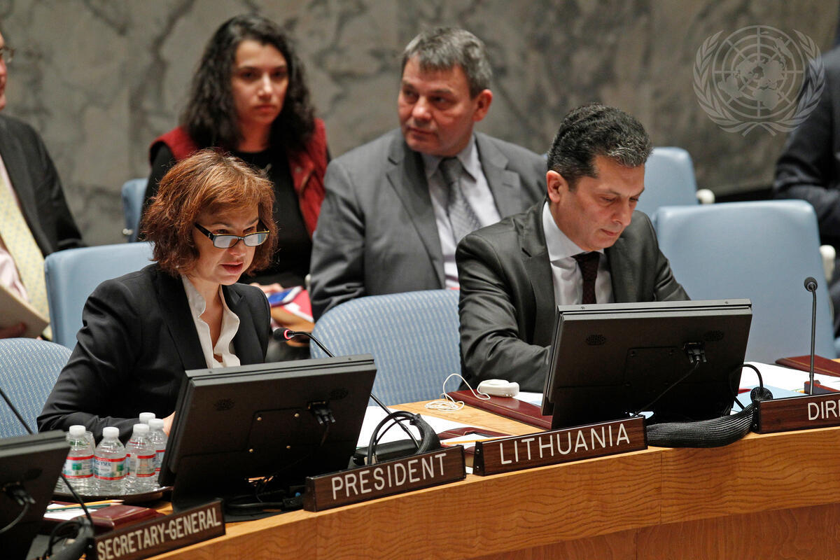 Raimonda Murmokaité (left), Permanent Representative of Lithuania to the UN and President of the Security Council for the month of February, chairs the meeting. On her left is Movses Abelian, Director of the Security Council Affairs Division.