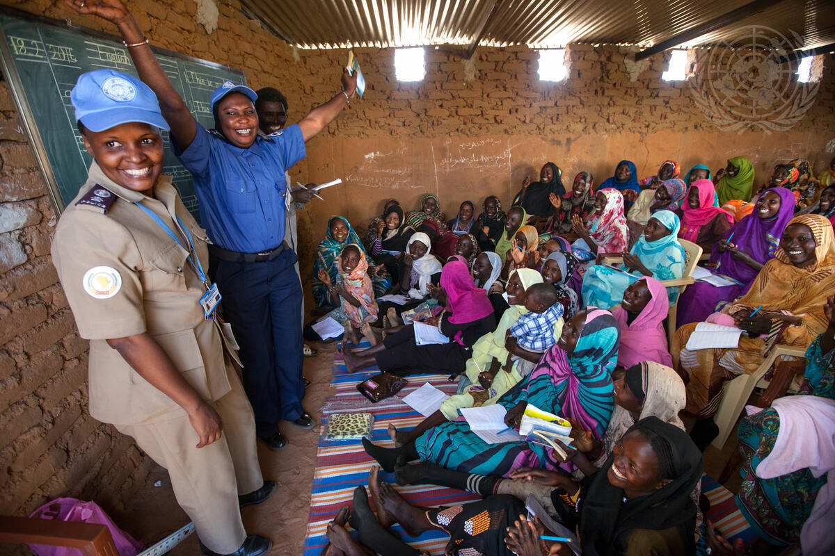 Women in Abu Shouk Camp for internally displaced persons (IDPs) near El Fasher, North Darfur, attend English classes conducted by volunteer teachers and facilitated by the police component of the African Union-United Nations Hybrid Operation in Darfur (UNAMID). Nearly 100 women, many with children, attend these classes three times a week in a school in the camp with materials (exercise books, notebooks, blackboards and chalk) provided by UNAMID Police.