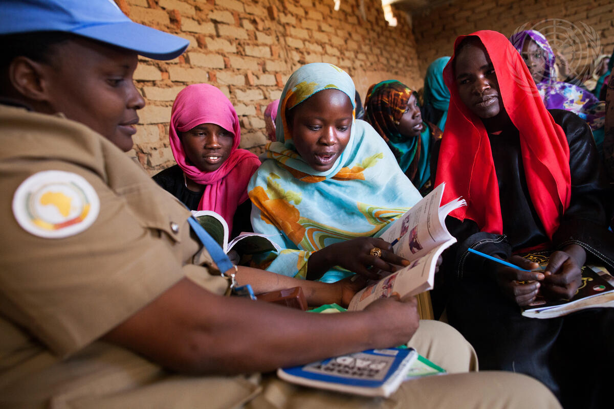Women in Abu Shouk Camp for internally displaced persons (IDPs) near El Fasher, North Darfur, attend English classes conducted by volunteer teachers and facilitated by the police component of the African Union-United Nations Hybrid Operation in Darfur (UNAMID). Nearly 100 women, many with children, attend these classes three times a week in a school in the camp with materials (exercise books, notebooks, blackboards and chalk) provided by UNAMID Police.