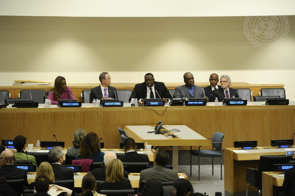 A view of the speakers’ dais, as Eugène-Richard Gasana (centre), Permanent Representative of the Republic of Rwanda to the UN, addresses the event. He is flanked by Secretary-General Ban Ki-moon (left) and John Ashe, President of the sixty-eighth session of the General Assembly. Also pictured: Immaculée Ilibagiza (left), Rwandan genocide survivor and author of the book, “Left to Tell”; and Gerald Caplan (right), academic and author of the report, “Rwanda: the Preventable Genocide”.
