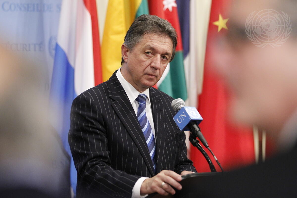 Yuriy Sergeyev, Permanent Representative of Ukraine to the UN, speaks to journalists following a meeting of the Security Council on the situation in his country.