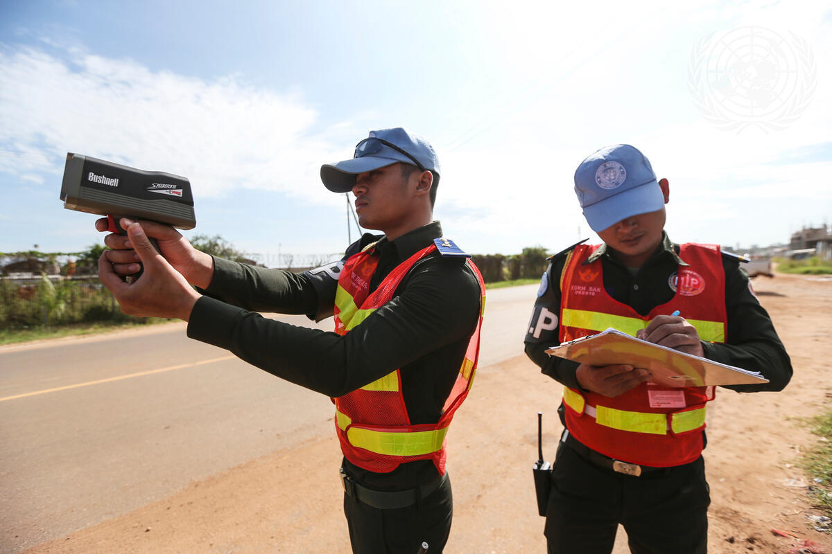 A member of the Cambodian Military Police contingent tries out a speed gun.