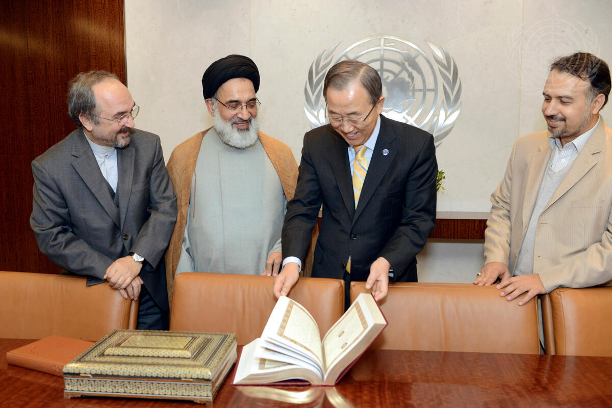 Secretary-General Ban Ki-moon (centre right) meets with Seyed Sadegh Mousavi (centre left), Iranian religious scholar and author. Also pictured: Mohammad Khazaee (left), Permanent Representative of the Islamic Republic of Iran to the UN; and Mohsen Eslami, Attaché at Iran’s Permanent Mission to the UN.