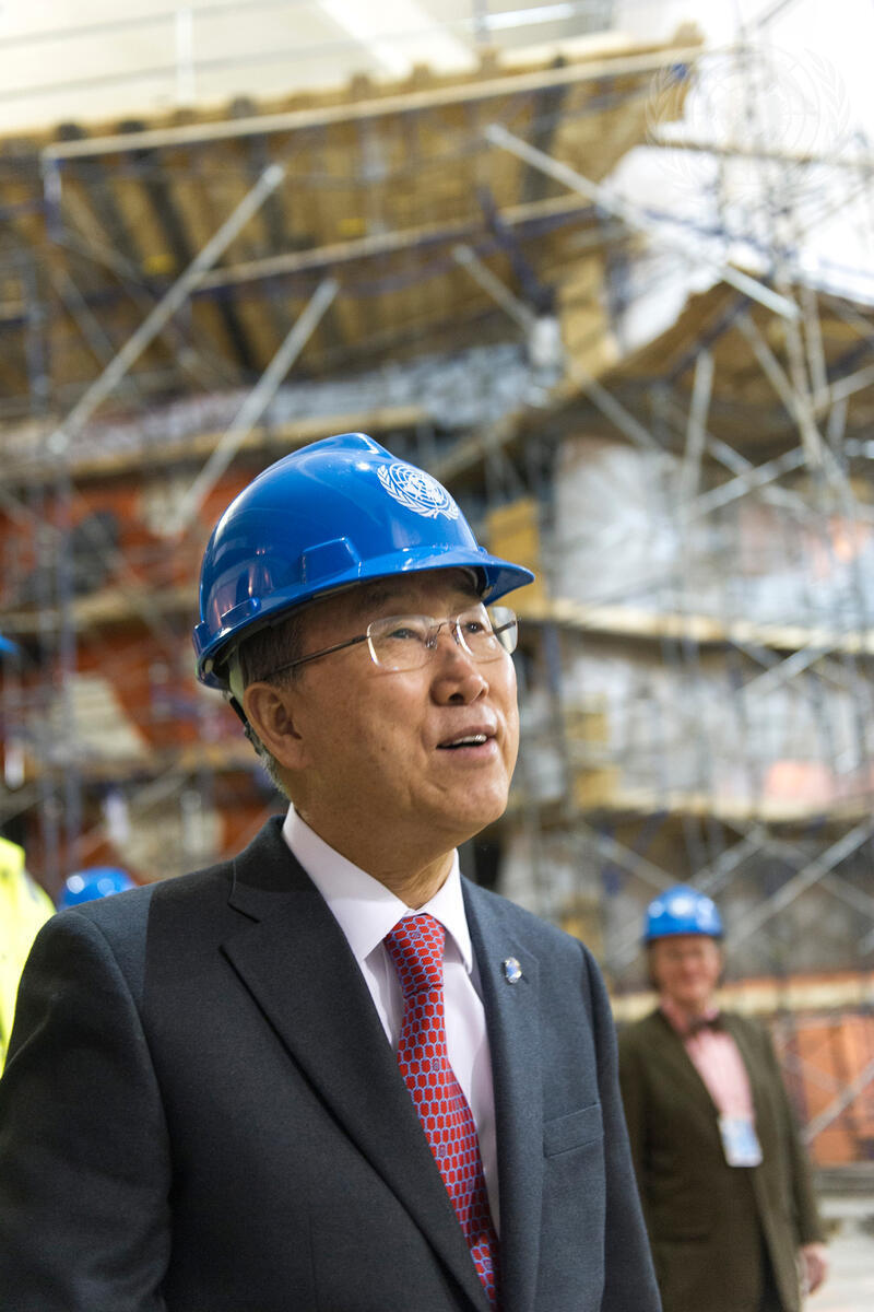 Secretary-General Ban Ki-moon tours the General Assembly Building where construction work is taking place under the Capital Master Plan (CMP) for the renovation of the UN Headquarters complex.