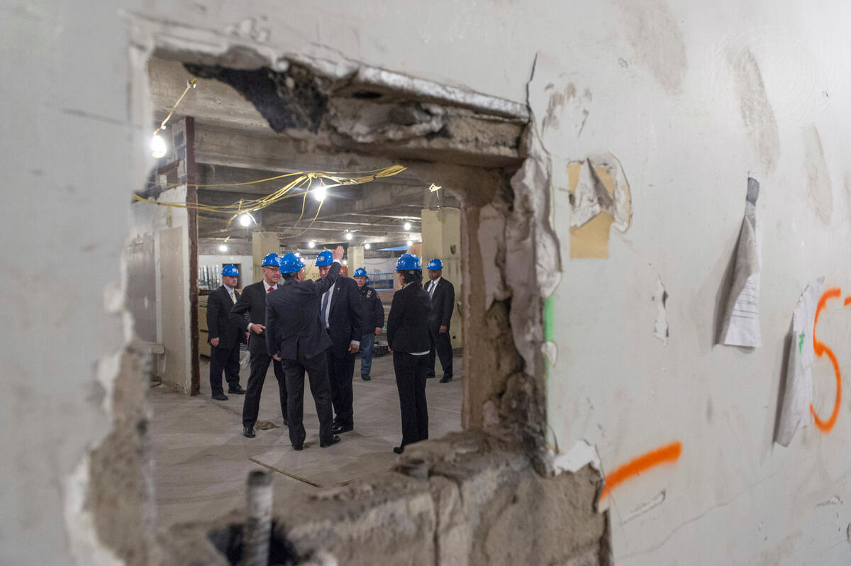 Secretary-General Ban Ki-moon (with arm raised) and Deputy Secretary-General Jan Eliasson (second from left) tour the General Assembly Building where construction work is taking place under the Capital Master Plan (CMP) for the renovation of the UN Headquarters complex.