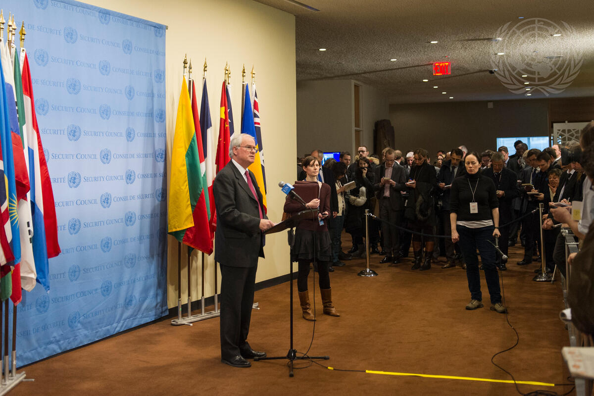 Mark Lyall Grant (left), Permanent Representative of the United Kingdom to the UN, speaks to journalists following urgent closed-door consultations of the Security Council on the situation in Ukraine. The Council meeting was requested by Ukraine, “due to the deterioration of the situation in [its] Autonomous Republic of the Crimea,” which threatens the territorial integrity” of the country.