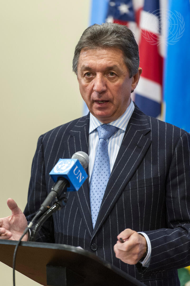 Yuriy Sergeyev, Permanent Representative of Ukraine to the UN, speaks to journalists following urgent closed-door consultations of the Security Council on the situation in his country. The Council meeting was requested by his government “due to the deterioration of the situation in the Autonomous Republic of the Crimea, Ukraine, which threatens the territorial integrity of the country.