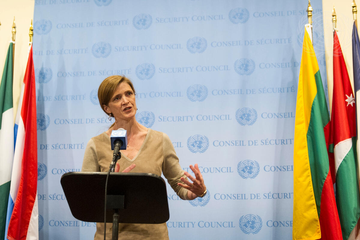 Samantha Power, United States Permanent Representative to the UN, speaks to journalists following urgent closed-door consultations of the Security Council on the situation in Ukraine. The Council meeting was requested by Ukraine, “due to the deterioration of the situation in [its] Autonomous Republic of the Crimea,” which threatens the territorial integrity of the country.