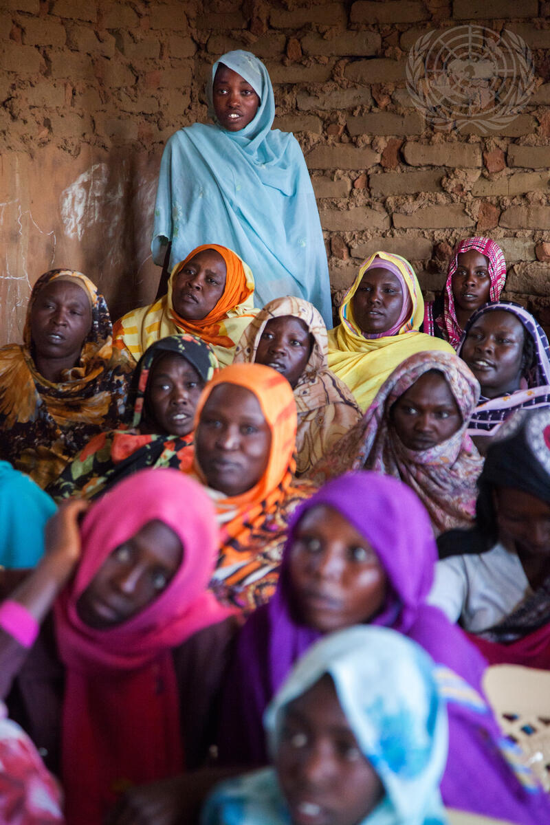 Women in Abu Shouk Camp for internally displaced persons (IDPs) near El Fasher, North Darfur, attend English classes conducted by volunteer teachers and facilitated by the police component of the African Union-United Nations Hybrid Operation in Darfur (UNAMID). Nearly 100 women, many with children, attend these classes three times a week in a school in the camp with materials (exercise books, notebooks, blackboards and chalk) provided by UNAMID Police.