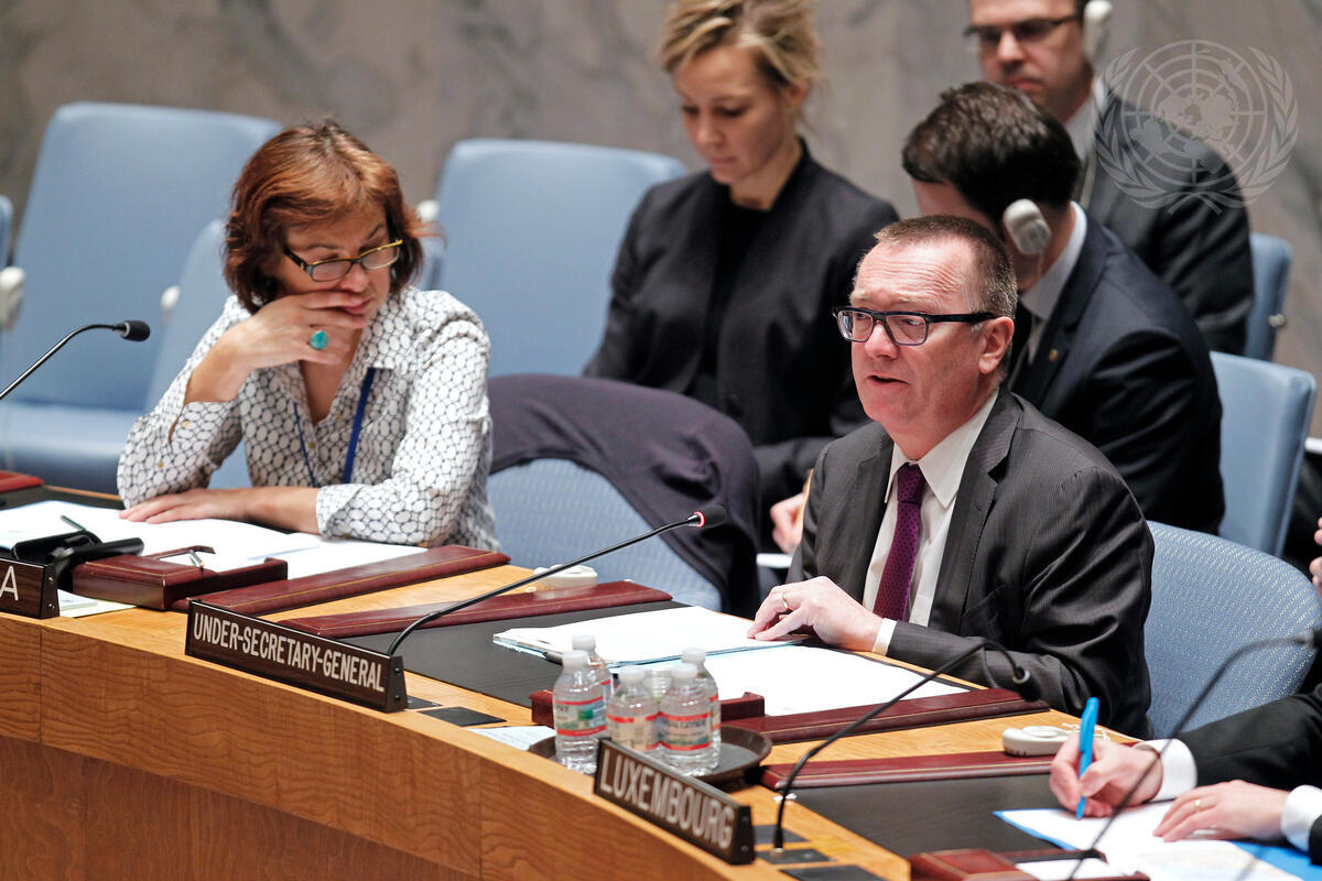 Jeffrey Feltman (right), Under-Secretary-General for Political Affairs, briefs the Security Council at its meeting on the situation in the Middle East, including the Palestinian question. On his right is Raimonda Murmokaité, Permanent Representative of Lithuania to the UN and Council President for the month of February.