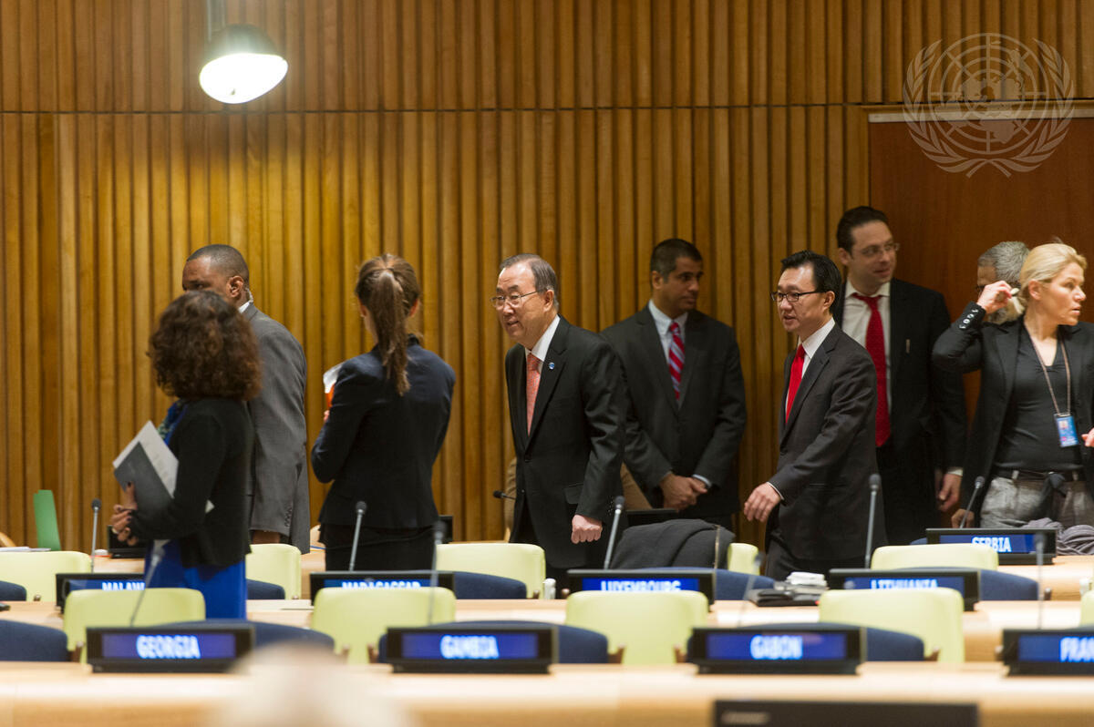 Secretary-General Ban Ki-moon (centre) arrives to brief the Assembly.