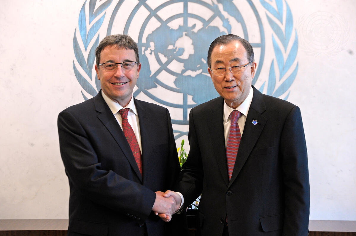 Secretary-General Ban Ki-moon (right) meets with Achim Steiner, Executive Director of the UN Environment Programme (UNEP).