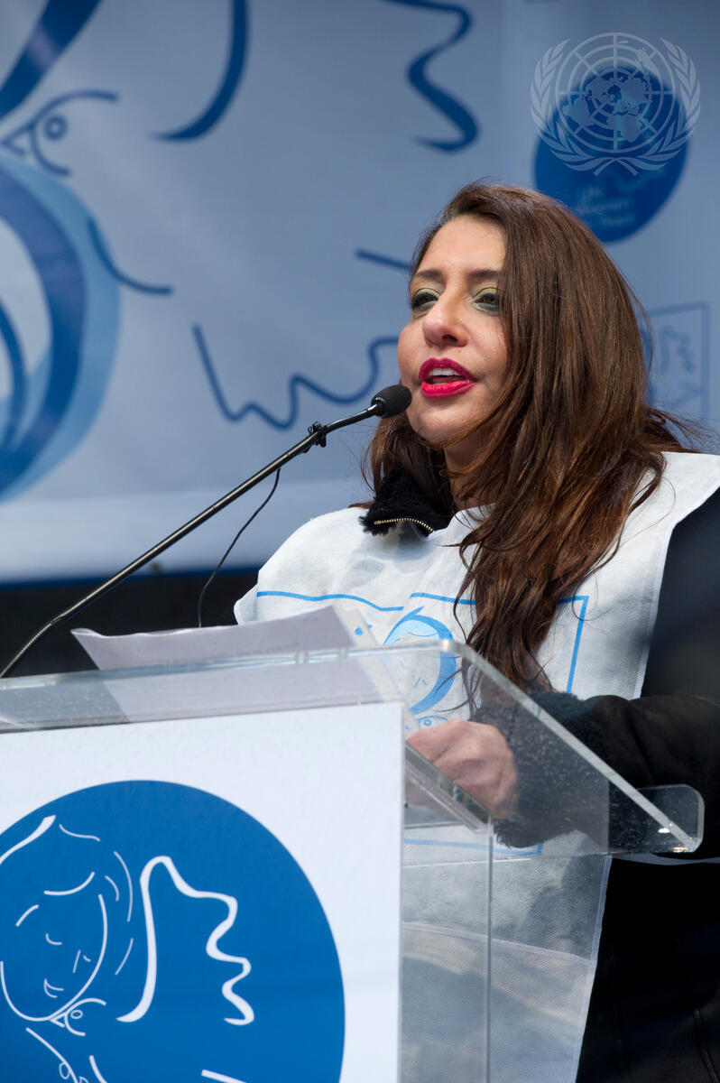 Yoo Soon-taek, wife of Secretary-General Ban Ki-moon, led a “UN Women for Peace” march outside the General Assembly Building, to mark International Women’ Day. Participants included Muna Ghassan Tamim Rihani (pictured speaking), wife of Nassir Abdulaziz Al-Nasser, High Representative of the UN Alliance of Civilizations.