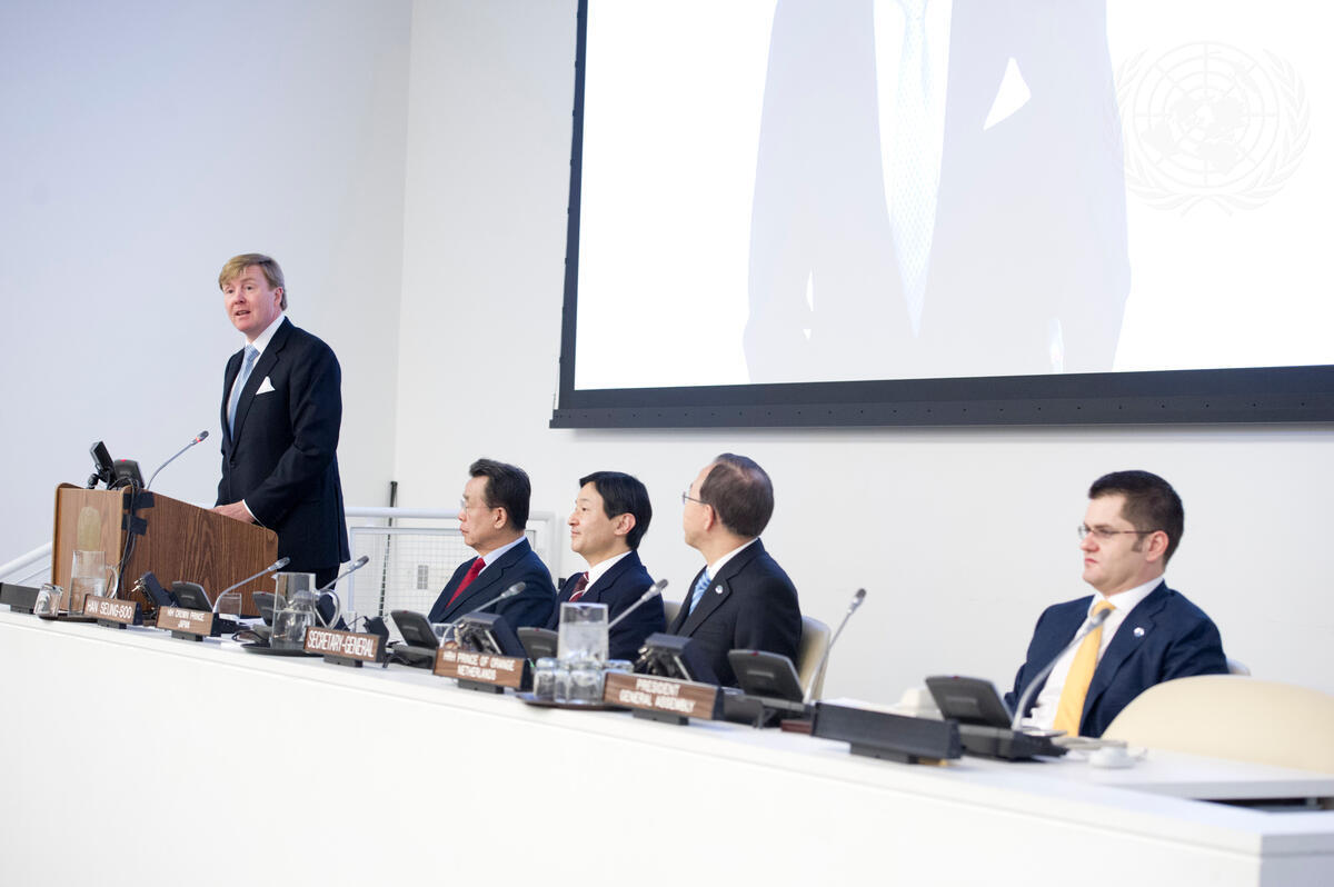 A day-long special thematic session of the General Assembly was held at UN Headquarters on the subject of water-related disasters. Prince Willem-Alexander (far left), the Prince of Orange of the Netherlands and Chair of the Secretary-General's Advisory Board on Water and Sanitation, was among the speakers at the opening of the session. Also pictured (from left): Han Seung-soo, former Prime Minister of the Republic of Korea and Founding Chair of the Advisory Board’s High-Level Expert Panel on Water and Disasters; Crown Prince Naruhito of Japan, Honorary President of the Advisory Board; Secretary-General Ban Ki-moon; and Vuk Jeremic, President of the sixty-seventh session of the General Assembly.