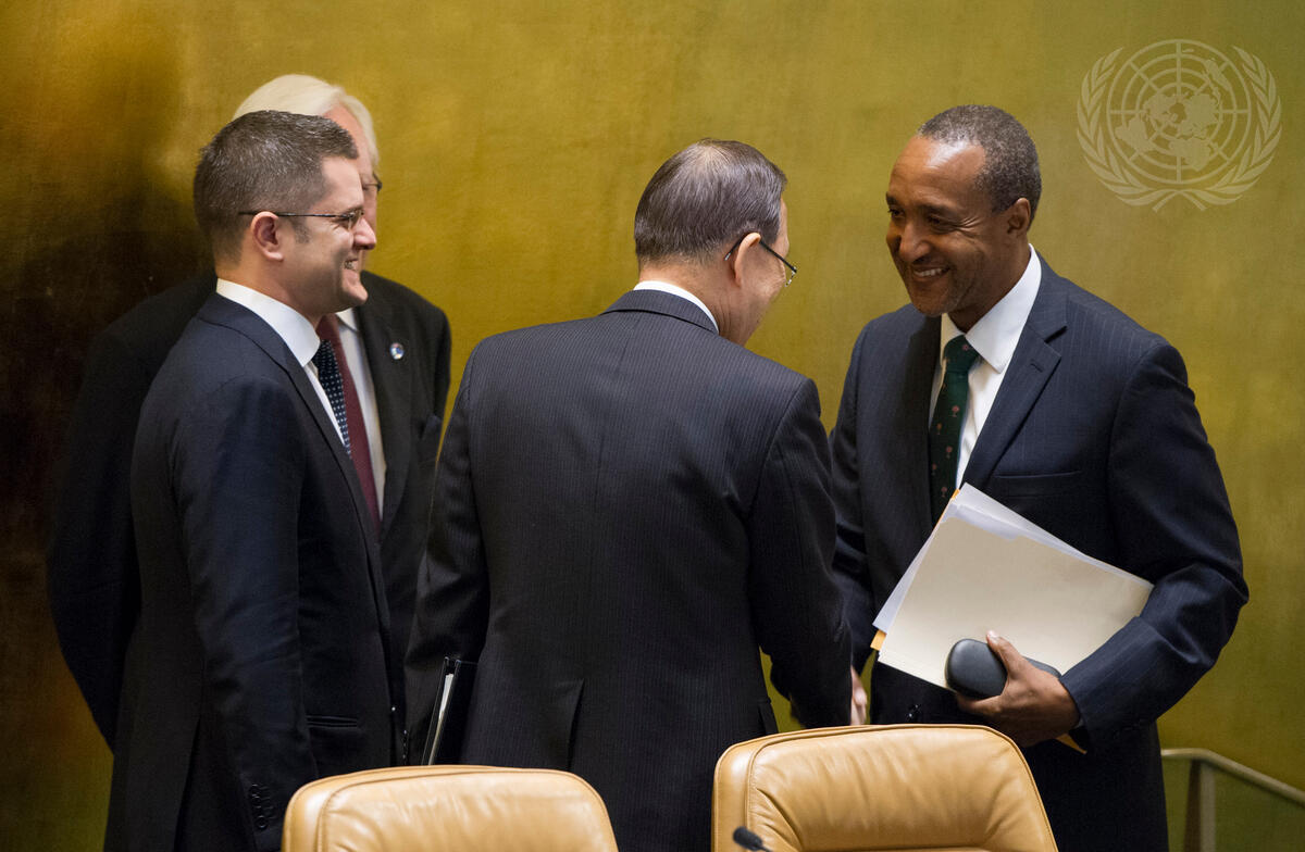 Macharia Kamau (right), Permanent Representative of the Republic of Kenya to the United Nations and Co-chair of the working group, shakes hands with Secretary-General Ban Ki-moon at the General Assembly's first meeting of the Open Working Group on Sustainable Development Goals (SDGs). To the Secretary-General's left is Vuk Jeremic, President of the sixty-seventh session of the General Assembly.
