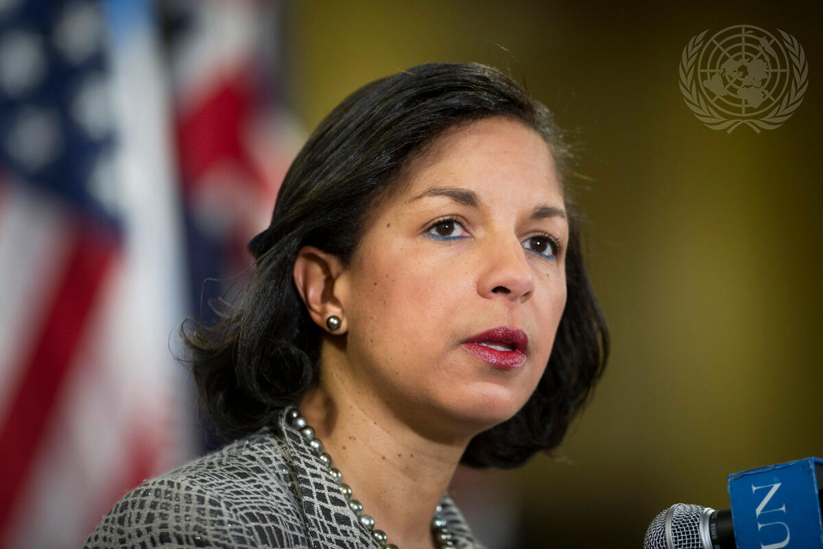 Susan Rice, Permanent Representative of the United States to the UN, speaks to journalists following the adoption of the resolution.