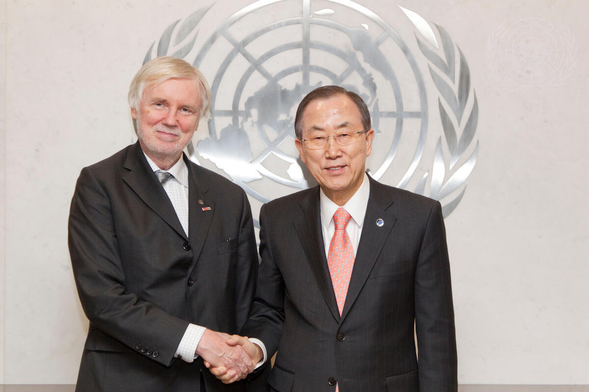 Secretary-General Ban Ki-moon (right) meets with Erkki Tuomioja, Minister for Foreign Affairs of Finland.