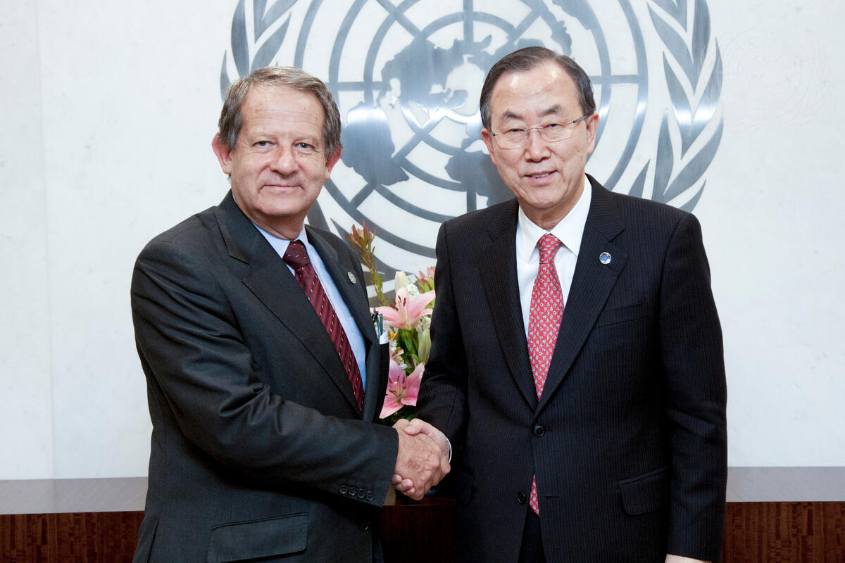 Secretary-General Ban Ki-moon (right) meets with Jens Anders Toyberg-Frandzen, Head of the United Nations Integrated Peacebuilding Office in Sierra Leone (UNIPSIL).