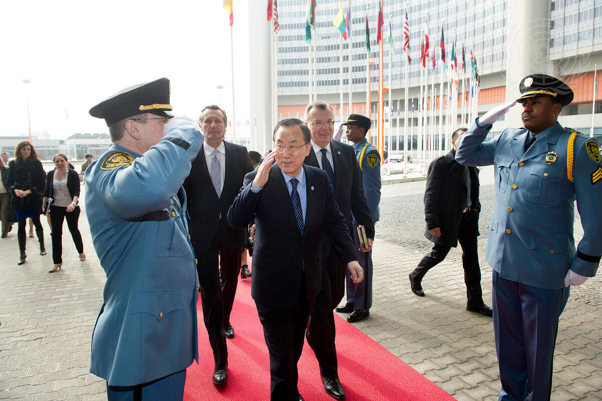 Secretary-General Ban Ki-moon (centre) salutes United Nations security officers as he arrives at the Vienna International Centre, accompanied by Tibor Tóth (left of Mr. Ban), Executive Secretary of the Preparatory Commission for the Comprehensive Nuclear-Test-Ban Treaty Organization (CTBTO), and Yury Fedotov, Director-General of the United Nations Office at Vienna (UNOV).