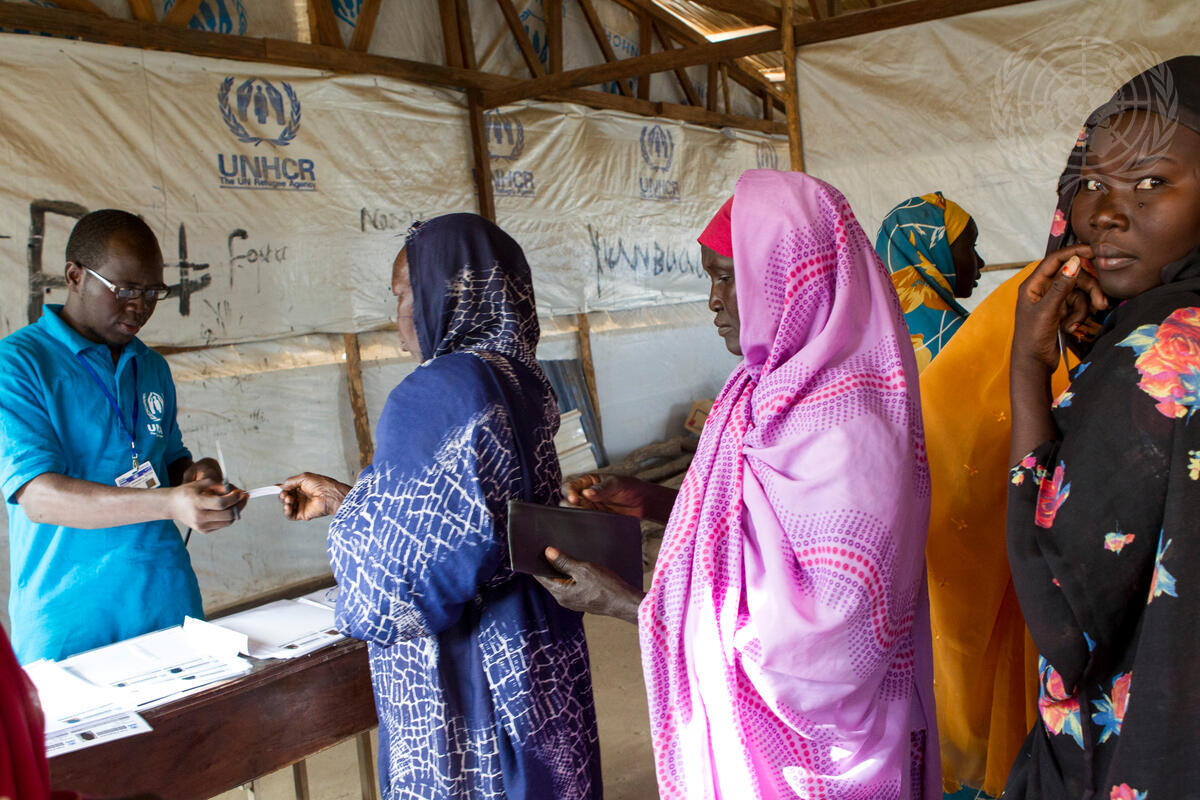 A UNHCR (UN Refugee Agency) registration officer issues identification cards to refugees at the refugee camp in Nyeel, South Sudan.