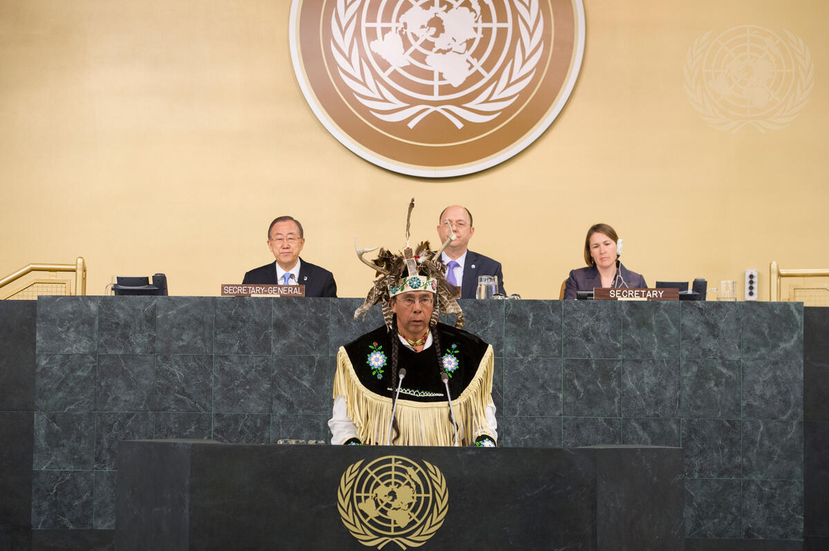 Tadodaho Sid Hill, Chief of the Onondaga Nation, delivers the annual ceremonial welcome to participants at the opening of the thirteenth session of the UN Permanent Forum on Indigenous Issues. Seated behind him (from left): Secretary-General Ban Ki-moon and Thomas Gass, Assistant Secretary-General for Policy Coordination and Inter-Agency Affairs, Department of Economic and Social Affairs (DESA).